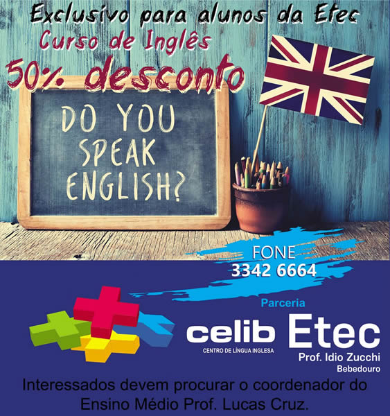 50% no curso inglê para alunos da Etec (interessados procurar o Prof. Lucas, para obter informações de novas turmas).