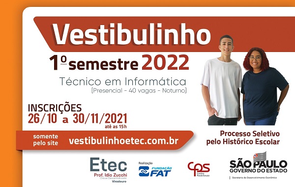As inscrições para o Vestibulinho 2022 da Etec, acontecem pelo site www.vestibulinhoetec.com.br. Serão disponibilizadas 40 vagas para o curso Técnico em Informática, presencial com aulas no período noturno, na escola NIMEF Prof. Antonio Mazza em Viradouro.