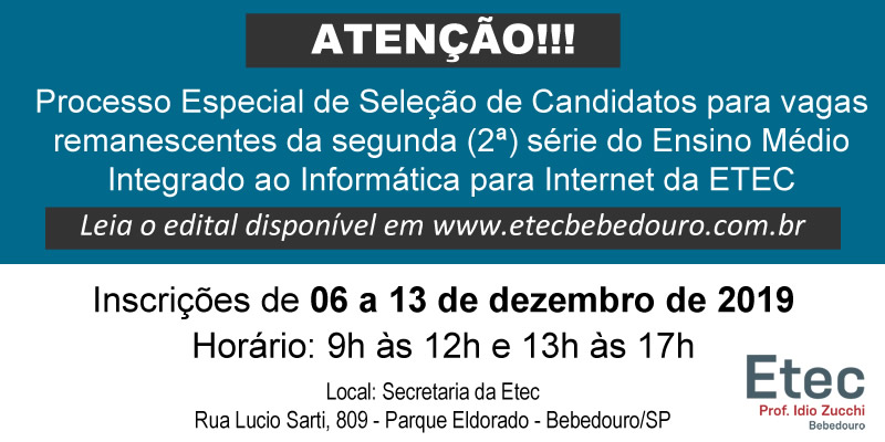 Vagas para segunda série do Ensino Médio - ETEC