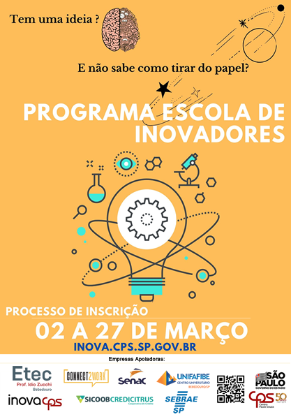 As inscrições para a 3º edição da Escola de Inovadores estão abertas até o dia 27/03, pelo site: inova.cps.sp.gov.br/programa-escola-de-inovadores.