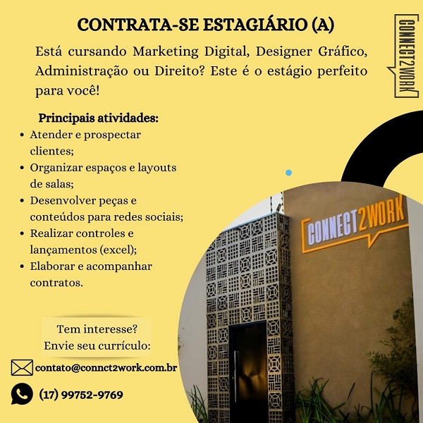O Connect2Work está com uma nova oportunidade de estágio. Se você conhece alguém que tenha determinação, nos indique ou envie essa oportunidade.