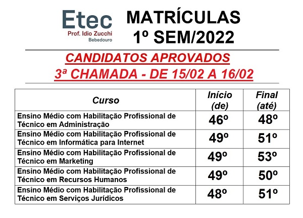 Serão enviados aos candidatos convocados da 3ª chamada, a partir de 15/02, nos e-mails cadastrados no momento da inscrição, a convocação de matrícula. O candidato deverá dar o “aceite” da vaga, no link que será disponibilizado na mensagem de convocação, para ter direito a sua vaga. Os documentos, obrigatórios para matrícula deverão ser enviados, entre os dias 15 e 16 de fevereiro, para o e-mail e151.vestibulinho@etec.sp.gov.br.