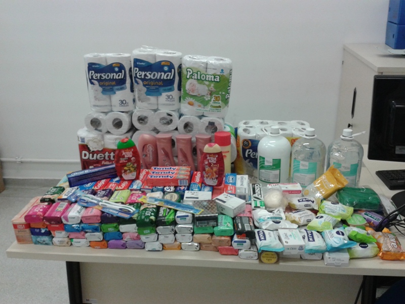 Os alunos Marcela Caon, José Paulo Oliveira e Laisa Bossi, representando as turmas do ensino médio, acompanhados da profa Andrea Bessa e do Prof. Rodrigo Campos, entregaram mais de 380 itens, como: papel higiênico, pasta de dentes, sabonete, shampoo, condicionador, esponja de banho e escovas de dentes.