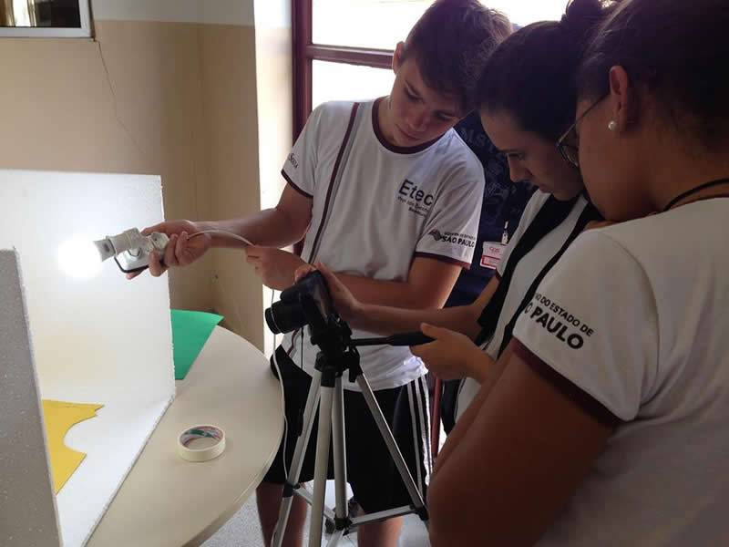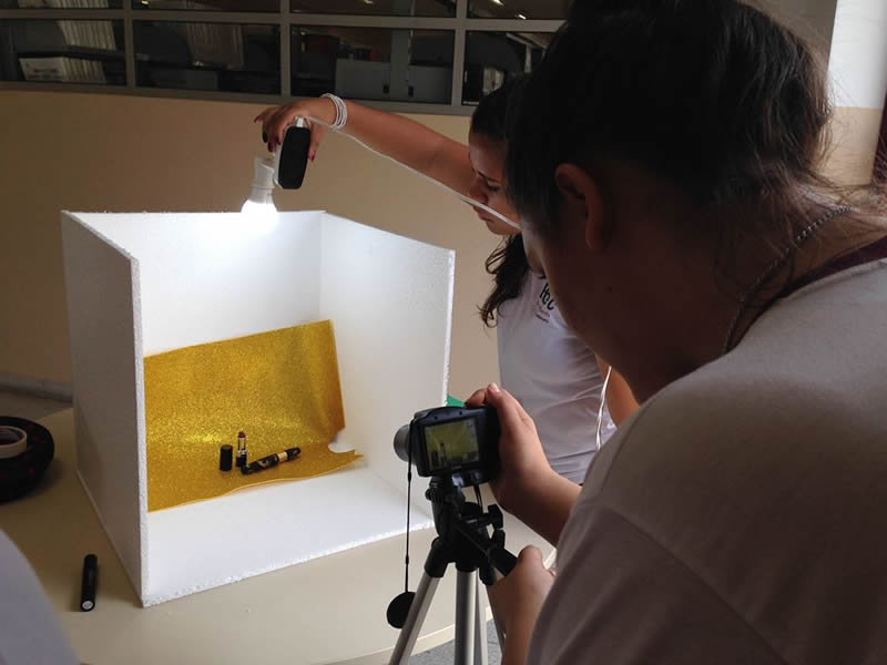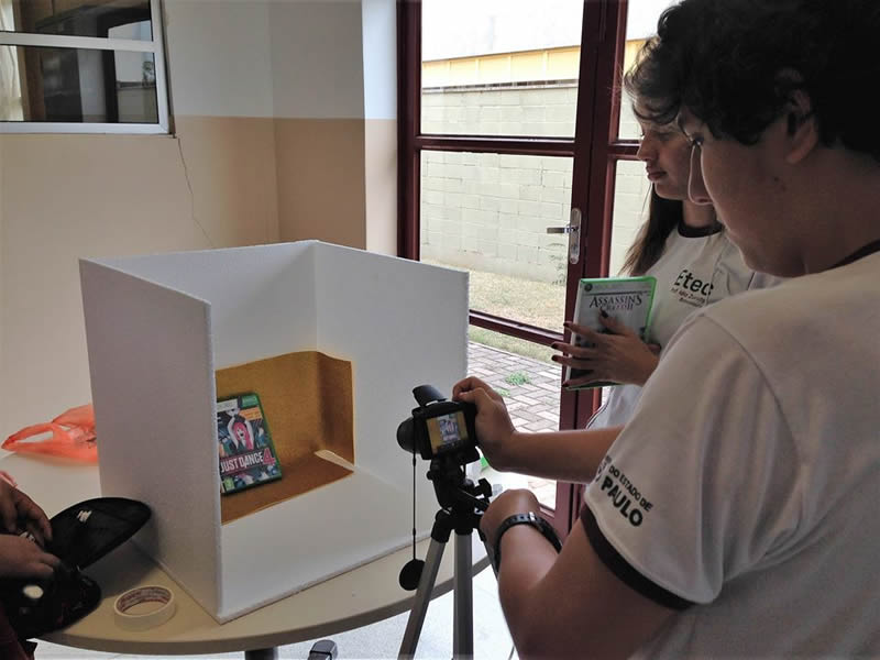 Com a ajuda do auxiliar docente Diego Tavares e da professora os estudantes usaram um mini estúdio, confeccionado em isopor, para fotografar os produtos, e um fundo branco para as fotos em que foram usados “modelos”.